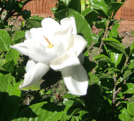 Immergrüner, tropischer Strauch mit weißen, duftenden Blüten und glänzenden, ledrigen, dunkelgrünen Blättern aus der Familie Rötegewächse (Rubiaceae). Sie ist beheimatet in Südchina, Taiwan, Vietnam und Südjapan, braucht feuchtes Klima mit warmen Tagen und kühlen Nächten, jedoch gedeiht sie auch in unserem Vorgarten gut. Unsere hat gefüllte Blüten, die anfangs weiß sind und verblühend sich gelb verfärben, sie duften sehr stark, verströmen einen jasminähnlichen Duft. Wir hatten sie vom Vorbesitzer mit übernommen.